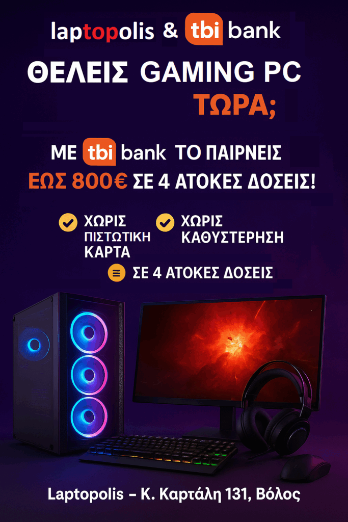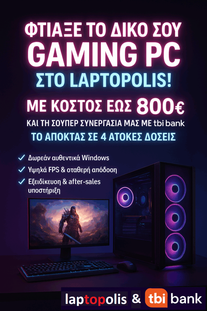 Φτιάξε Gaming PC στο Laptopolis έως 800€, με δωρεάν Windows & αγορά σε 4 άτοκες δόσεις μέσω tbi bank. Ισχύει για gamers & επαγγελματίες